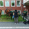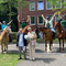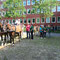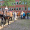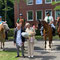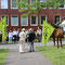 Natürlich ließ es sich die VFD nicht nehmen, ein stimmungsvolles Hochzeitsspalier zu stellen. Zu Pferd ritten Sina auf Nabucco, Alessia auf Goetz, Denise auf Slider und Gaby mit Khassim an; in deren Schlepptau die Reitbegleithunde Ronja und Sherlock, die von Svea geführt wurden. Dazu viele weitere Vereinskameraden. Sogar die jüngsten VFD-Kinder Mia (2 Jahre) und Jonathan (3 Jahre) hielten enthusiastisch die Vereinsfahnen und stimmten in den allgemeinen Jubel mit ein.